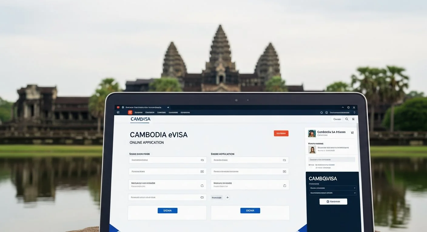 Cambodia eVisa online application portal with Angkor Wat temple in background